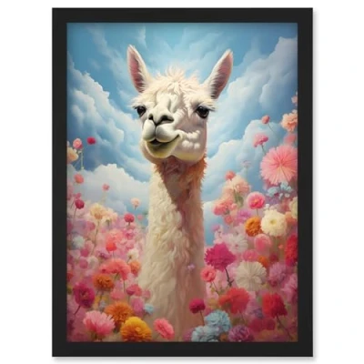 Artery8 Happy Llama Peeking Head Over Pink Flowers Bright Colourful Artwork Kids Bedroom Dreamy Spring Meadow Framed Wall Art Print A4