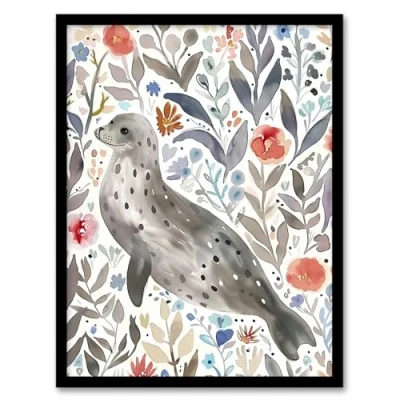 Artery8 Happy Seal with Coastal Wildflowers Watercolour Living Room Artwork Framed Wall Art Print A4