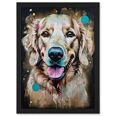 Artery8 Happy Smiling Golden Retriever Dog Portrait Artwork Framed A3 Wall Art Print