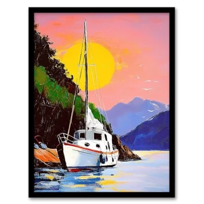 Artery8 Harbour Sunset Docked Sailboat Coastal Landscape Bathroom Toilet Artwork Framed Wall Art Print A4