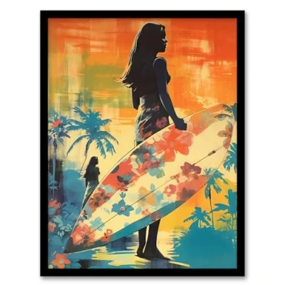 Artery8 Hawaiian Surf Print Retro Palm Tree Floral In Blue And Orange Vibrant Bold Bright Colourful Painting Artwork Framed Wall Art A4