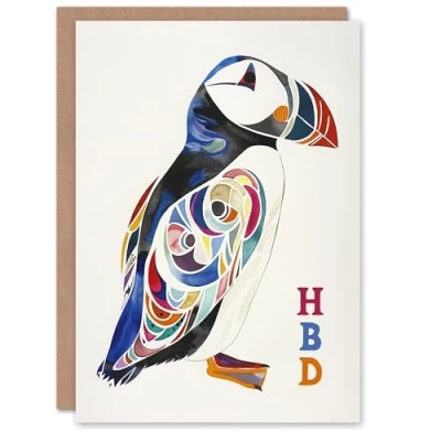 Artery8 HBD Puffin Bird Bright Colourful Pattern Folk Art Blank For Him Or Her Birthday Card