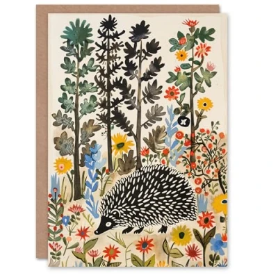Artery8 Hedgehog in Forest Folk Art Painting Wildflowers Greeting Birthday Card Him Her All Blank