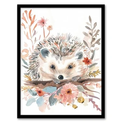 Artery8 Hedgehog in Wildflowers Modern Watercolour Pastel Living Room Artwork Framed Wall Art Print A4