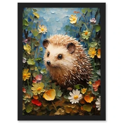 Artery8 Hedgehog Wildflower Meadow Thick Paint Oil Painting Kids Bedroom Cute Woodland Creature Artwork Framed A3 Wall Art Print