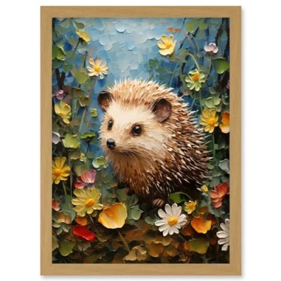 Artery8 Hedgehog Wildflower Meadow Thick Paint Oil Painting Kids Bedroom Cute Woodland Creature Artwork Framed Wall Art Print A4