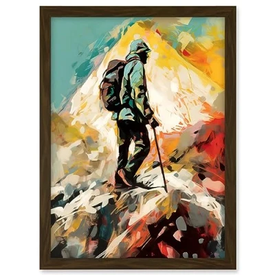 Artery8 Hiker Reaching Mountain Peak Modern Oil Painting Artwork Framed A3 Wall Art Print