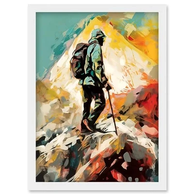 Artery8 Hiker Reaching Mountain Peak Modern Oil Painting Artwork Framed Wall Art Print A4