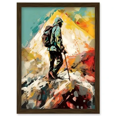 Artery8 Hiker Reaching Mountain Peak Modern Oil Painting Artwork Framed Wall Art Print A4