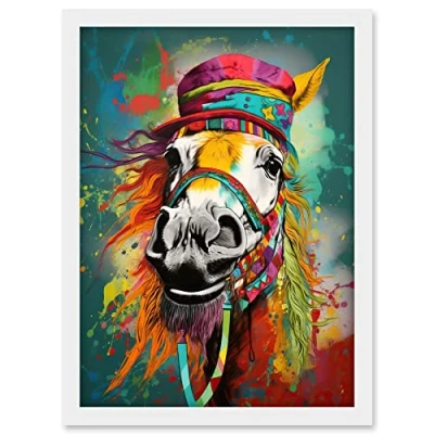 Artery8 Hippie Horse with Multicoloured Hat and Bridles Artwork Framed A3 Wall Art Print