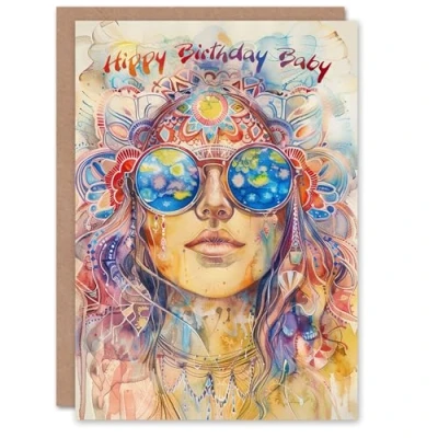 Artery8 Hippy Birthday Hippie Woman Mandala Watercolour Blank For Him Or Her Art Card