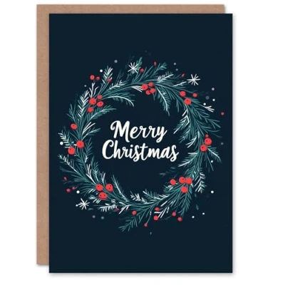 Artery8 Holly Pine Tree Round Wreath Blue Blank For Him Or Her Art Xmas Festive Christmas Card