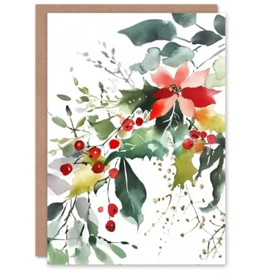 Artery8 Holly Tree Poinsettia Festive Flower Blank For Him Or Her Art Xmas Christmas Card