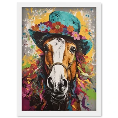 Artery8 Horse Wearing a Flower Summer Hat Multicoloured Artwork Framed Wall Art Print A4