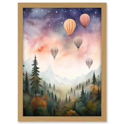 Artery8 Hot Air Balloons Over Misty Forest Landscape Watercolour Painting Orange Green Purple Dreamy Dusk Sky Stars Kids Bedroom Artwork Framed A3 Wall Art Print