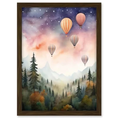 Artery8 Hot Air Balloons Over Misty Forest Landscape Watercolour Painting Orange Green Purple Dreamy Dusk Sky Stars Kids Bedroom Artwork Framed A3 Wall Art Print