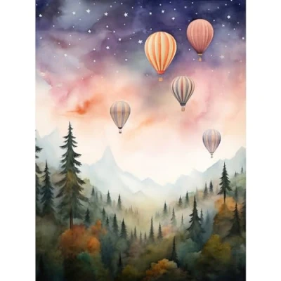 Artery8 Hot Air Balloons Over Misty Forest Landscape Watercolour Painting Orange Green Purple Dreamy Dusk Sky Stars Kids Bedroom Extra Large XL Wall Art Poster Print