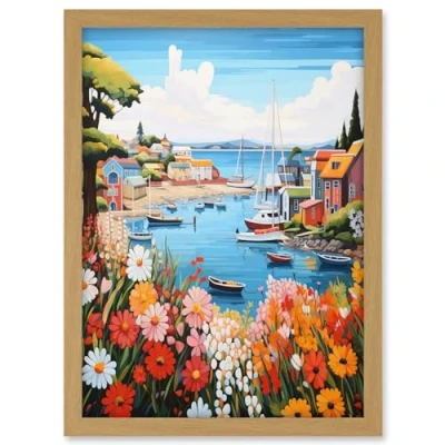 Artery8 Idyllic Scenic Seaside Fishing Village Bright Oil Painting Orange Pink Blue Bathroom Floral Artwork Harbor Bay Boats Coastal Landscape Framed A3 Wall Art Print