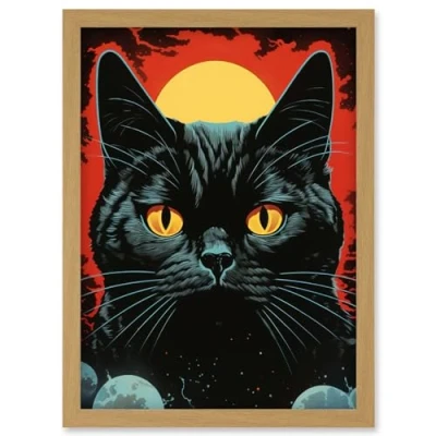 Artery8 In the Shadow of Celestial Black Cat Vintage Pulp Art Sci Fi Cover Artwork Red Yellow Blue Solar Eclipse Framed Wall Print A4
