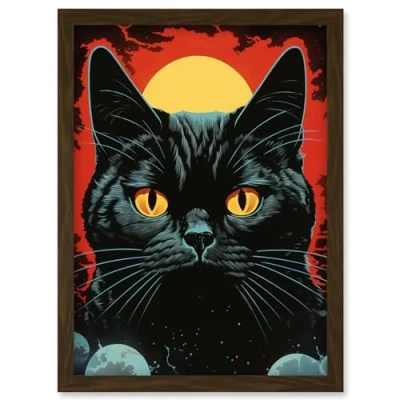 Artery8 In the Shadow of Celestial Black Cat Vintage Pulp Art Sci Fi Cover Artwork Red Yellow Blue Solar Eclipse Framed Wall Print A4