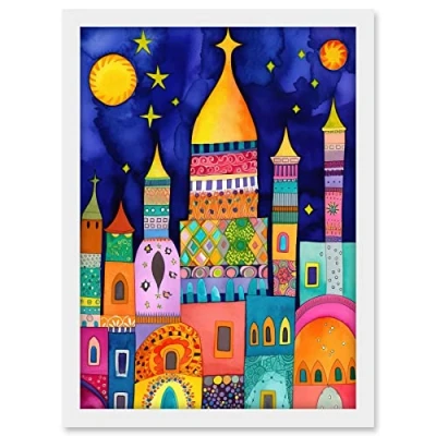 Artery8 Islamic Cityscape Moonlight Mosque Folk Art Artwork Framed A3 Wall Print