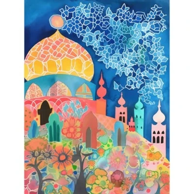 Artery8 Islamic Mosque At Night Folk Art Watercolour Painting Extra Large XL Wall Poster Print