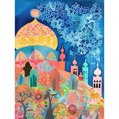 Artery8 Islamic Mosque At Night Folk Art Watercolour Painting Large Wall Poster Print Thick Paper 18X24 Inch
