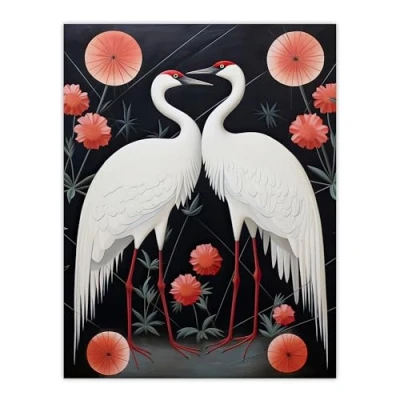 Artery8 Japanese Crane Dance Stylised Oil Painting Pink White Grey Birds and Flowers Abstract Floral Landscape Extra Large XL Wall Art Poster Print