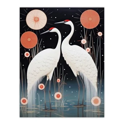 Artery8 Japanese Cranes Oil Painting Pink Blue White Birds and Abstract Flowers Surreal Lake Landscape at Night Extra Large XL Wall Art Poster Print