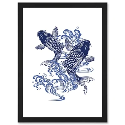 Artery8 Japanese Koi Carp Fish Illustration Water Artwork Framed Wall Art Print A4