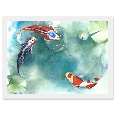 Artery8 Japanese Koi Carp Fish With Lilies A4 Artwork Framed Wall Art Print