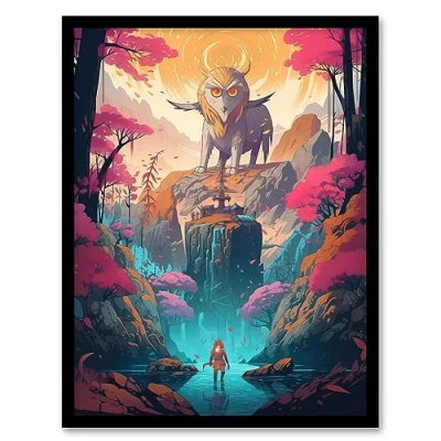 Artery8 Japanese Yokai Concept Art Painting Mythical Folklore Creature Standing Before Warrior in a Cherry Blossom Forest Landscape Artwork Framed Wall Print A4