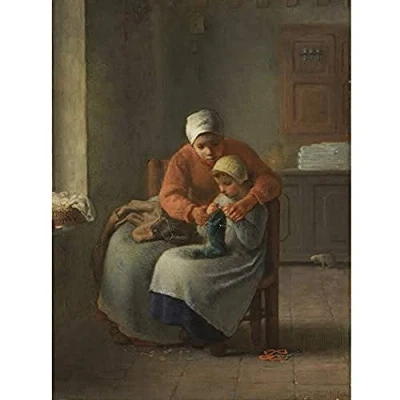 Artery8 Jean Francois Millet The Knitting Lesson Painting Art Print Canvas Premium Wall Decor Poster Mural