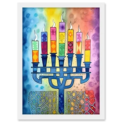 Artery8 Jewish Menorah Candles Multicolour Folk Art Watercolour Painting Artwork Framed A3 Wall Print