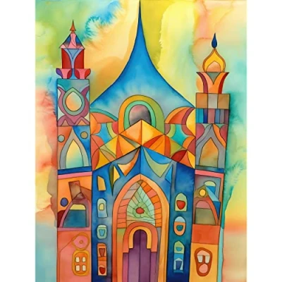 Artery8 Jewish Synagogue Building Multicoloured Folk Art Watercolour Painting Large Wall Poster Print Thick Paper 18X24 Inch