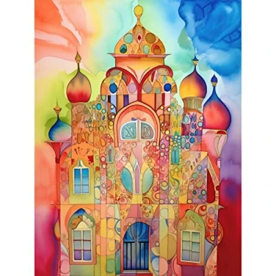 Artery8 Jewish Synagogue Decorated Building Vibrant Folk Art Watercolour Painting Large Wall Poster Print Thick Paper 18X24 Inch