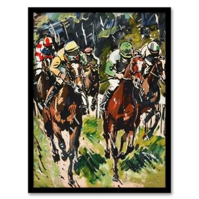 Artery8 Jockeys in Horse Racing Scene Modernist Painting Man Cave Fathers Day Artwork Framed Wall Art Print A4
