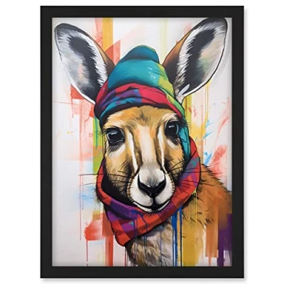 Artery8 Kangaroo Wearing Colourful Winter Hat and Scarf Artwork Framed A3 Wall Art Print