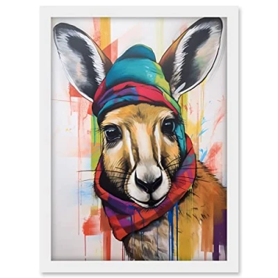 Artery8 Kangaroo Wearing Colourful Winter Hat and Scarf Artwork Framed A3 Wall Art Print