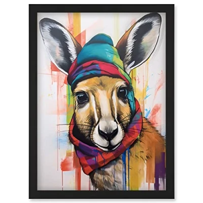 Artery8 Kangaroo Wearing Colourful Winter Hat and Scarf Artwork Framed Wall Art Print A4