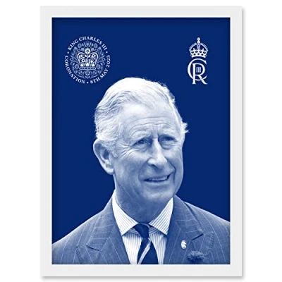 Artery8 King Charles III Coronation Royal Blue Portrait Picture with Crest and Emblem Artwork Framed Wall Art Print A4