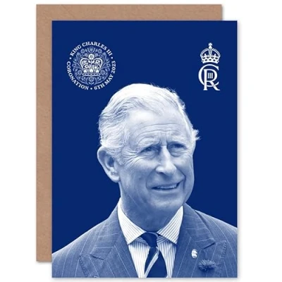 Artery8 King Charles III Coronation Royal Blue Portrait Picture with Crest and Emblem Sealed Greeting Card Plus Envelope Blank inside