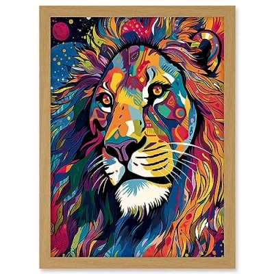 Artery8 King of the Jungle Lion Head Psychedelic Folk Portrait Vibrant Colourful Patterns Artwork Framed A3 Wall Art Print