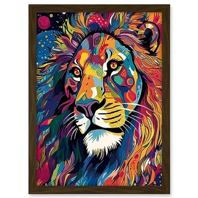 Artery8 King of the Jungle Lion Head Psychedelic Folk Portrait Vibrant Colourful Patterns Artwork Framed A3 Wall Art Print