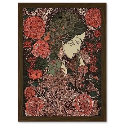 Artery8 Kiss from a Rose Floral Red and Green Illustration Artwork Framed Wall Art Print A4