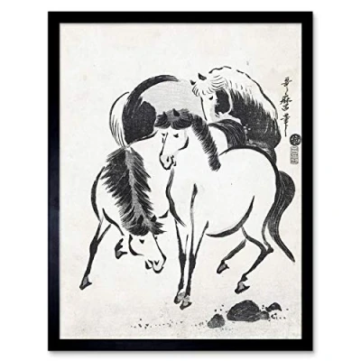 Artery8 Kitagawa Utamaro Three Horses Japanese Drawing Art Print Framed Poster Wall Decor 12x16 inch