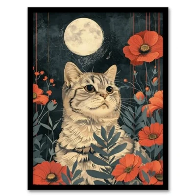 Artery8 Kitten in Poppies by Moon Cat Lover Animal Nature For Living Room Artwork Framed Wall Art Print A4