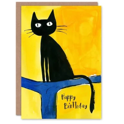 Artery8 Kitten on Tree Bold Yellow Blue Black Cat Lover Blank For Him Or Her Art Birthday Card