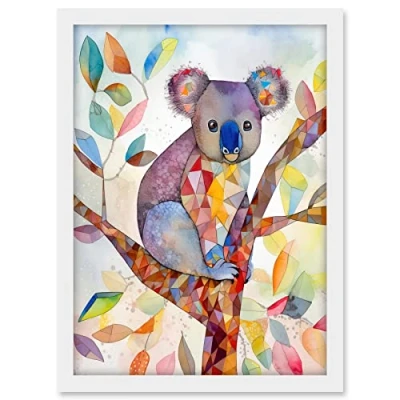 Artery8 Koala On Tree With Multicolour Polygon Pattern Folk Art Watercolour Painting Artwork Framed A3 Wall Print