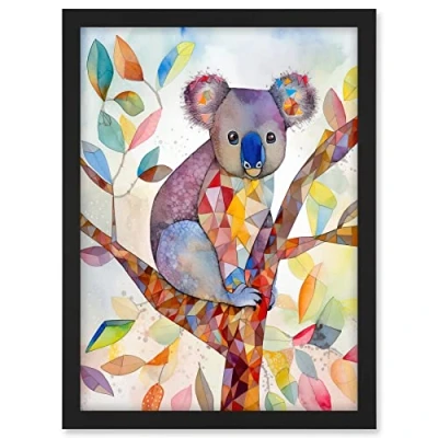 Artery8 Koala On Tree With Multicolour Polygon Pattern Folk Art Watercolour Painting Artwork Framed A3 Wall Print